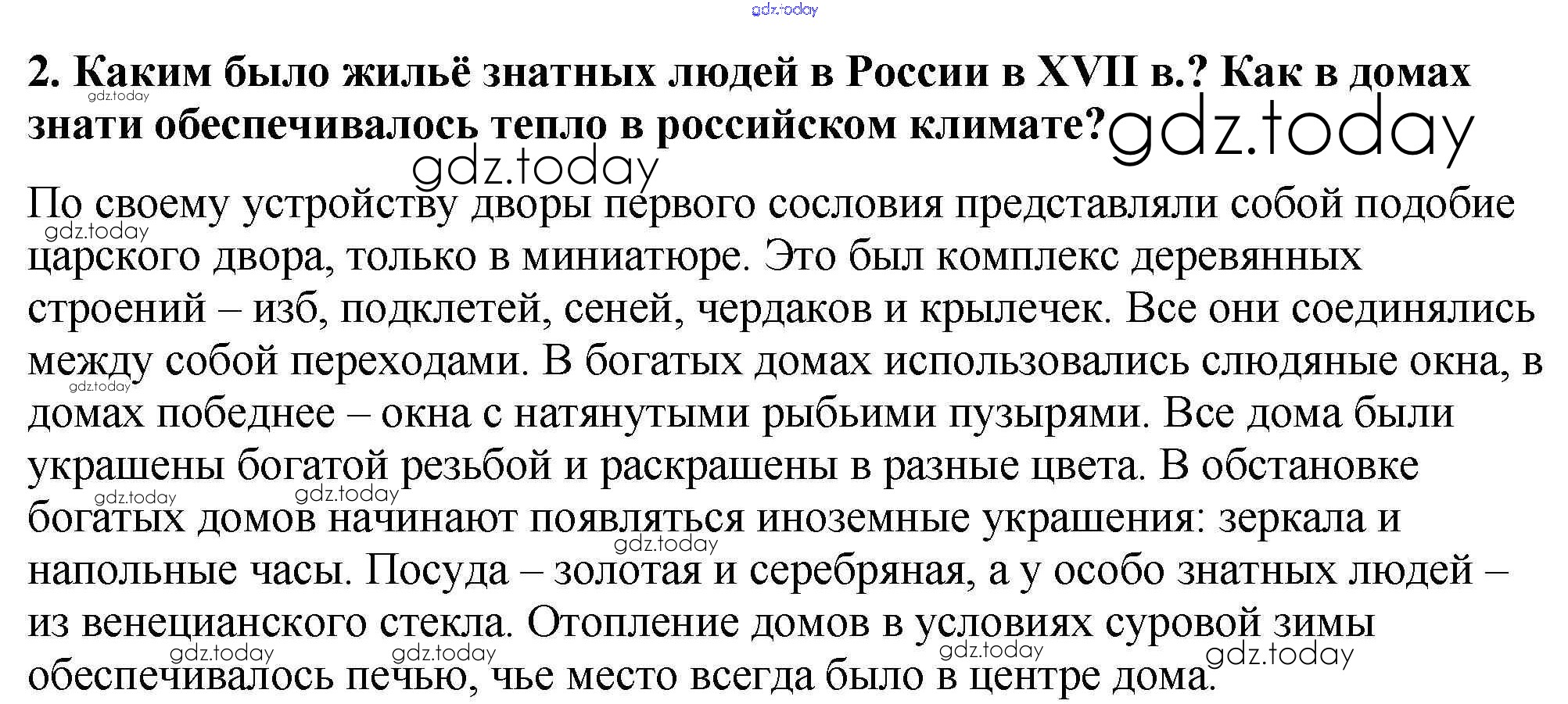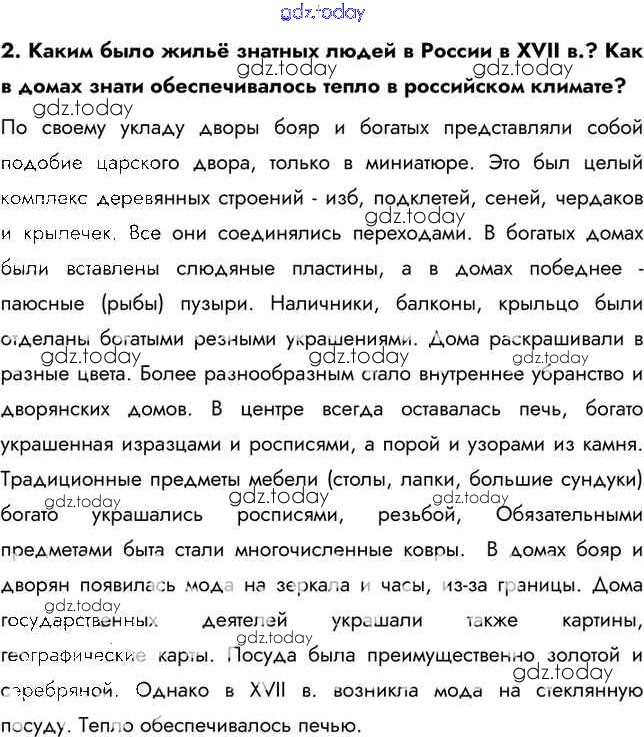 На страницах сайта gdz.today вы найдете учебный и вспомогательный материал, направленный на улучшения знаний школьной программы. ГДЗ - онлайн мир знаний Вопросы и задания Сословный быт и картина мира русского человека в XVII в. 2 Учебнику по Истории России для 7 класса Арсентьев, Данилов Просвещение 2016