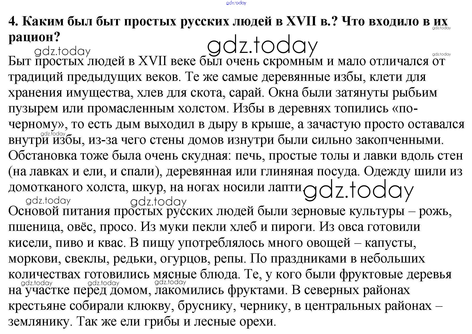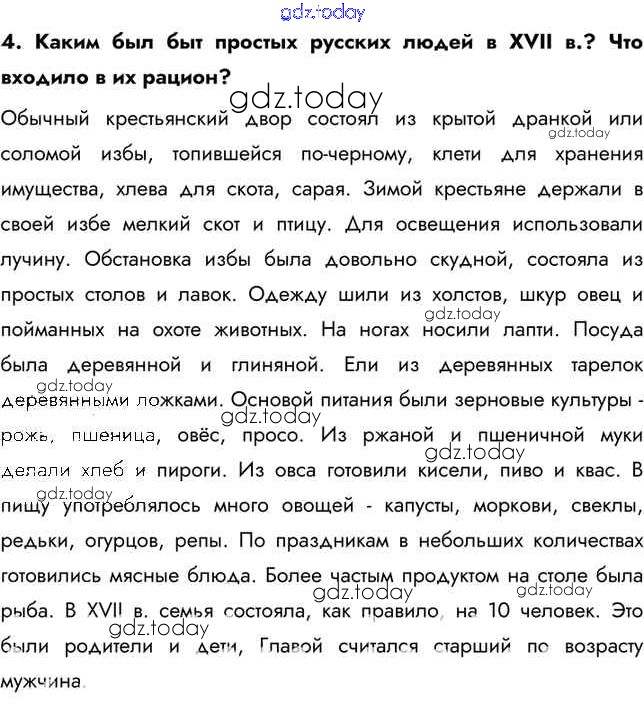 На страницах сайта gdz.today вы найдете учебный и вспомогательный материал, направленный на улучшения знаний школьной программы. ГДЗ - онлайн мир знаний Вопросы и задания Сословный быт и картина мира русского человека в XVII в. 4 Учебнику по Истории России для 7 класса Арсентьев, Данилов Просвещение 2016