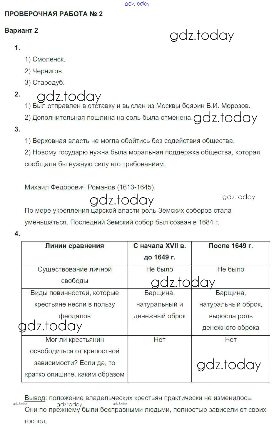 На страницах сайта gdz.today вы найдете учебный и вспомогательный материал, направленный на улучшения знаний школьной программы. ГДЗ - онлайн мир знаний Проверочная работа 2 Решение. Россия в XVII в. Вариант 2 Тетради-экзаменатору по Истории России для 7 класса Артасов Просвещение Сферы 2018