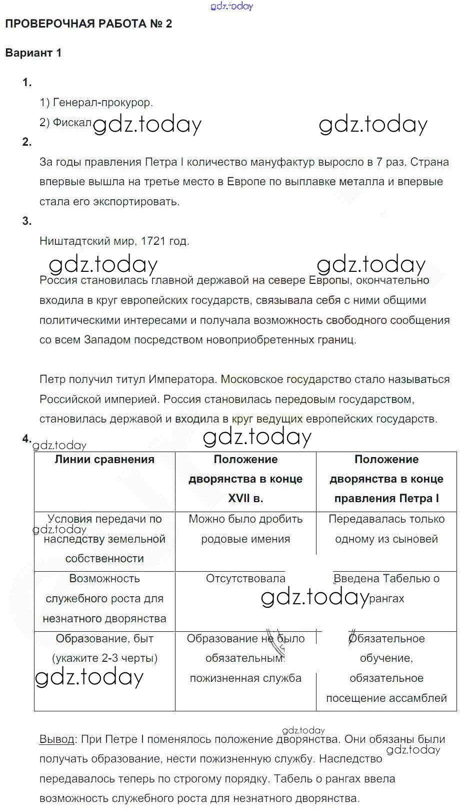 На страницах сайта gdz.today вы найдете учебный и вспомогательный материал, направленный на улучшения знаний школьной программы. ГДЗ - онлайн мир знаний Проверочная работа 2 Решение. Россия при Петре I Вариант 1 Тетради-экзаменатору по Истории России для 7 класса Артасов Просвещение Сферы 2018