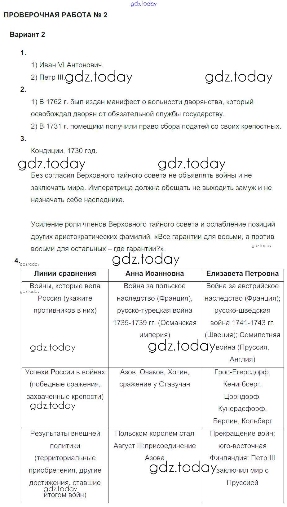 На страницах сайта gdz.today вы найдете учебный и вспомогательный материал, направленный на улучшения знаний школьной программы. ГДЗ - онлайн мир знаний Проверочная работа 2 Решение. Россия в 1725-1762 гг. Вариант 2 Тетради-экзаменатору по Истории России для 7 класса Артасов Просвещение Сферы 2018