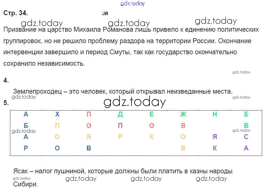 На страницах сайта gdz.today вы найдете учебный и вспомогательный материал, направленный на улучшения знаний школьной программы. ГДЗ - онлайн мир знаний Страницы (решение) 34 Рабочей тетради по Истории России для 7 класса Баранов Вентана-граф Алгоритм успеха 2017