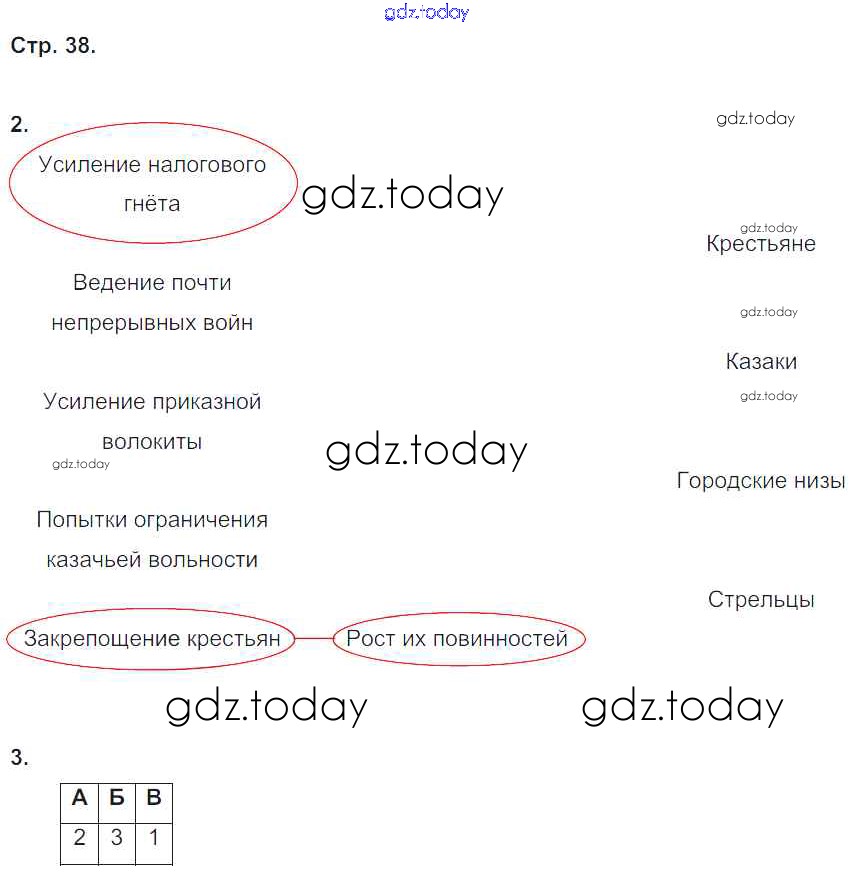 На страницах сайта gdz.today вы найдете учебный и вспомогательный материал, направленный на улучшения знаний школьной программы. ГДЗ - онлайн мир знаний Решение к части 2. Страницы 38 Рабочей тетради по Истории России для 7 класса Чернова Экзамен УМК 2017