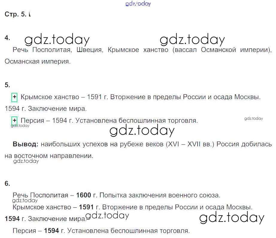 На страницах сайта gdz.today вы найдете учебный и вспомогательный материал, направленный на улучшения знаний школьной программы. ГДЗ - онлайн мир знаний Решение к части 2. Страницы 5 Рабочей тетради по Истории России для 7 класса Чернова Экзамен УМК 2017