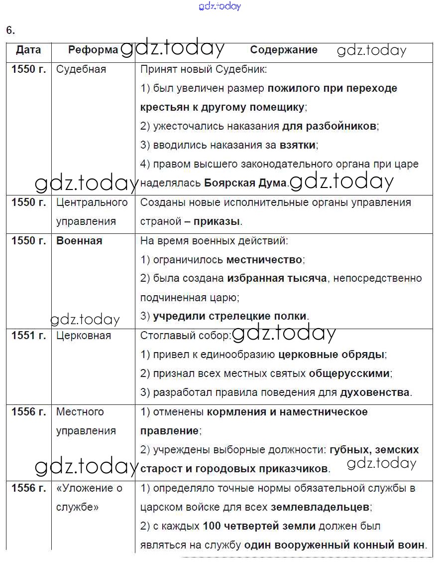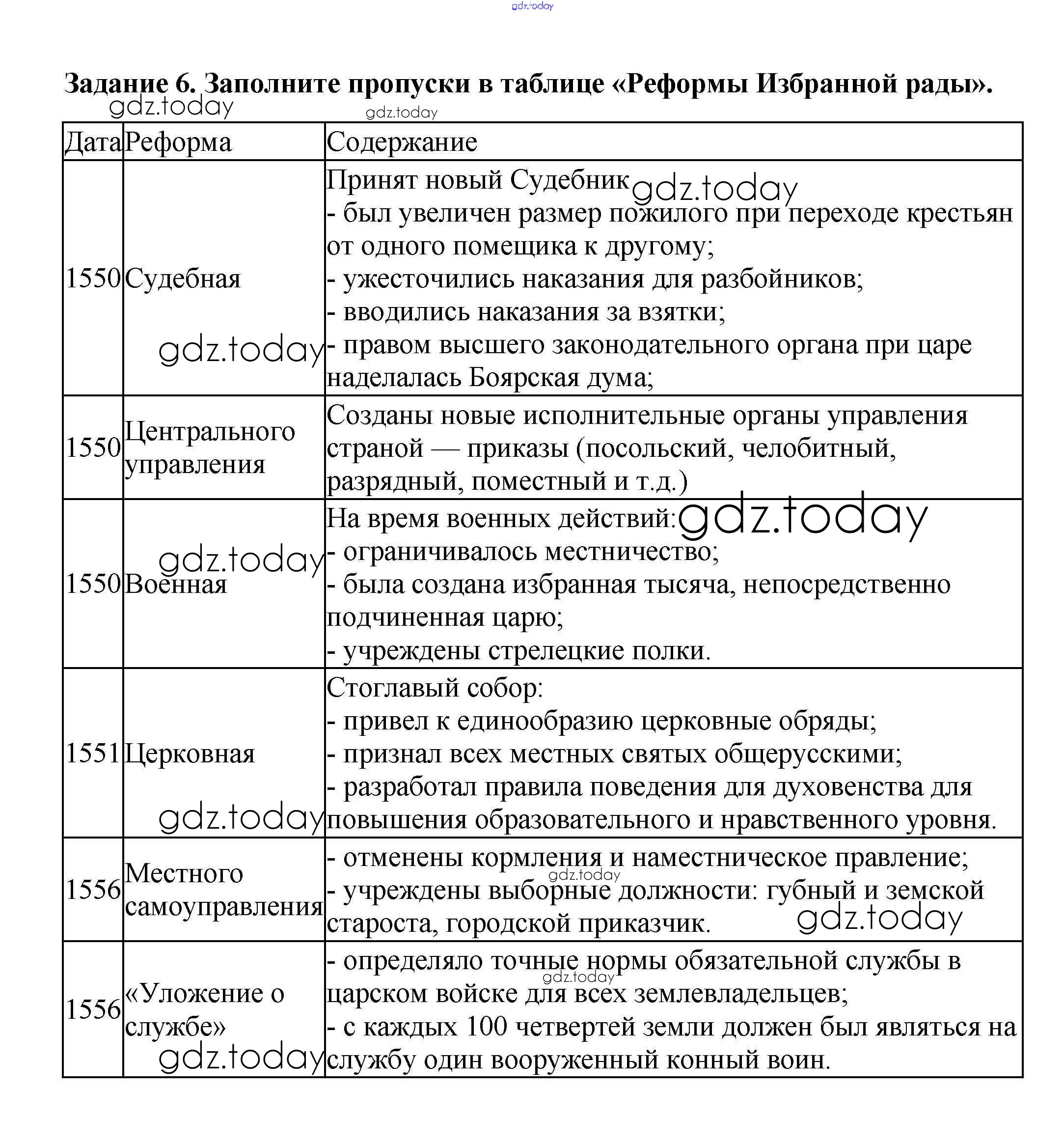 На страницах сайта gdz.today вы найдете учебный и вспомогательный материал, направленный на улучшения знаний школьной программы. ГДЗ - онлайн мир знаний Решение к § 6. Начало правление Ивана IV. Реформы Избранной рады 6 Рабочей тетради по Истории России для 7 класса Данилов, Косулина Просвещение УМК 2016