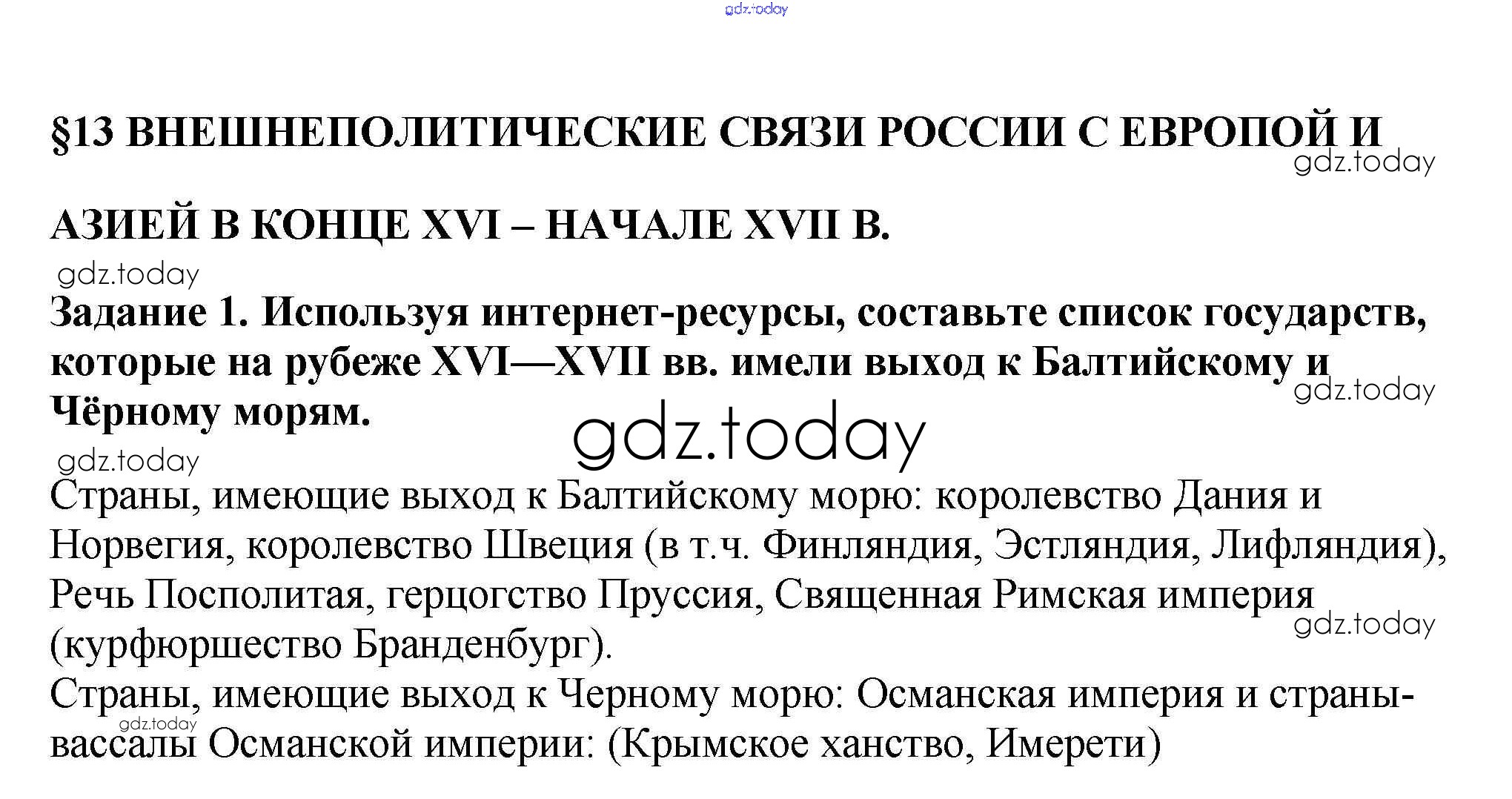На страницах сайта gdz.today вы найдете учебный и вспомогательный материал, направленный на улучшения знаний школьной программы. ГДЗ - онлайн мир знаний Решение к § 13. Внешнеполитические связи России с Европой и Азией в конце XVI — начале XVII в. 1 Рабочей тетради по Истории России для 7 класса Данилов, Косулина Просвещение УМК 2016