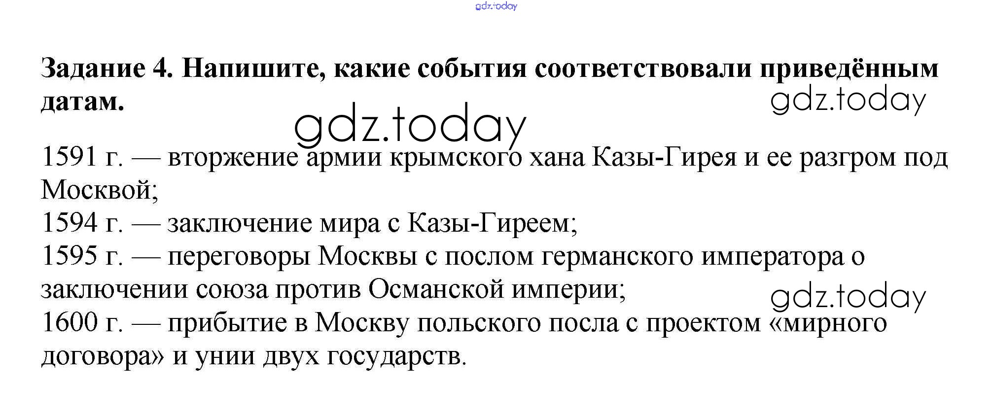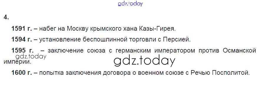 На страницах сайта gdz.today вы найдете учебный и вспомогательный материал, направленный на улучшения знаний школьной программы. ГДЗ - онлайн мир знаний Решение к § 13. Внешнеполитические связи России с Европой и Азией в конце XVI — начале XVII в. 4 Рабочей тетради по Истории России для 7 класса Данилов, Косулина Просвещение УМК 2016