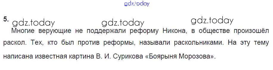 На страницах сайта gdz.today вы найдете учебный и вспомогательный материал, направленный на улучшения знаний школьной программы. ГДЗ - онлайн мир знаний Решение к § 24. Русская православная церковь в XVII в. Реформа патриарха Никона и раскол 5 Рабочей тетради по Истории России для 7 класса Данилов, Косулина Просвещение УМК 2016