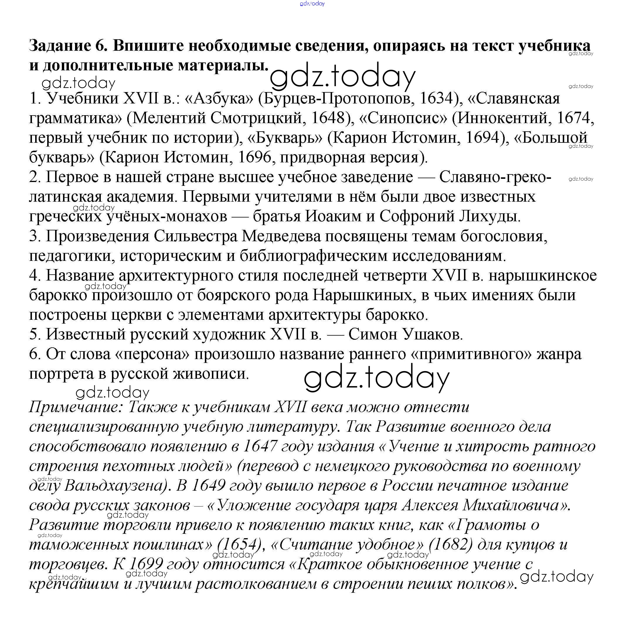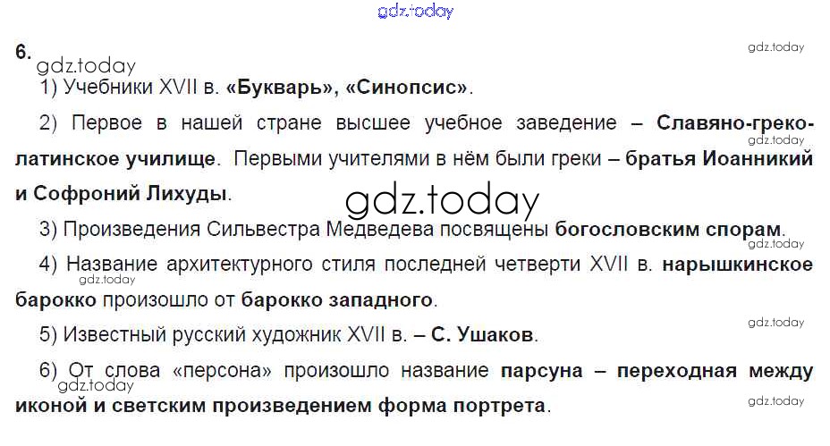 На страницах сайта gdz.today вы найдете учебный и вспомогательный материал, направленный на улучшения знаний школьной программы. ГДЗ - онлайн мир знаний Решение к § 26. Культура народов России в XVII в. 6 Рабочей тетради по Истории России для 7 класса Данилов, Косулина Просвещение УМК 2016
