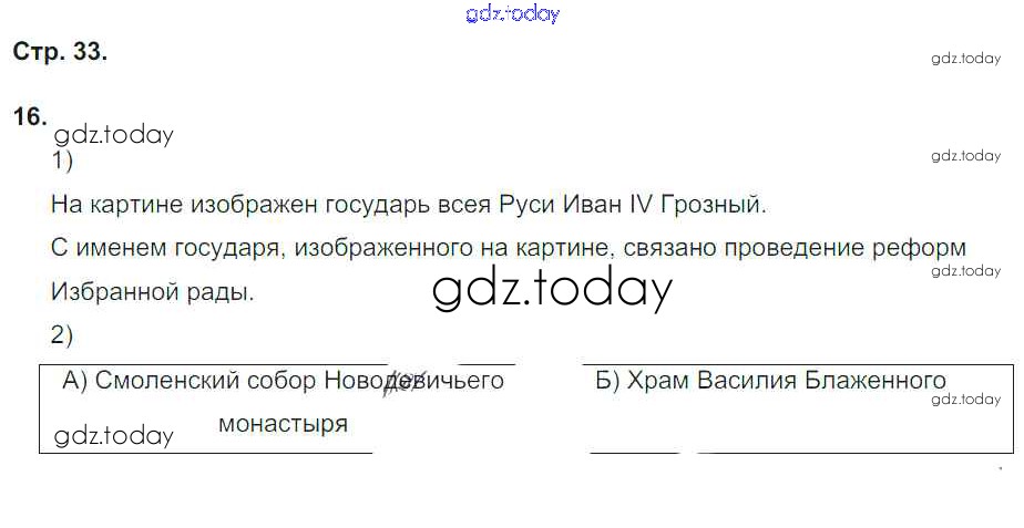 На страницах сайта gdz.today вы найдете учебный и вспомогательный материал, направленный на улучшения знаний школьной программы. ГДЗ - онлайн мир знаний Страницы (решение) 33 Рабочей тетради по Истории России для 7 класса Гевуркова Экзамен УМК 2018