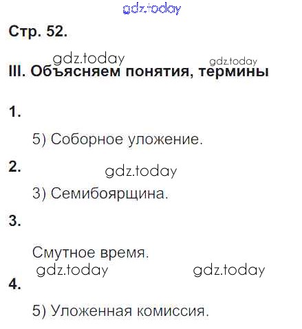 Ответы к Страницы (решение) 52 Рабочей тетради по Истории России для 7 класса Гевуркова Экзамен УМК 2018