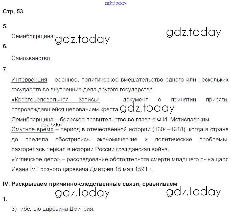 На страницах сайта gdz.today вы найдете учебный и вспомогательный материал, направленный на улучшения знаний школьной программы. ГДЗ - онлайн мир знаний Страницы (решение) 53 Рабочей тетради по Истории России для 7 класса Гевуркова Экзамен УМК 2018