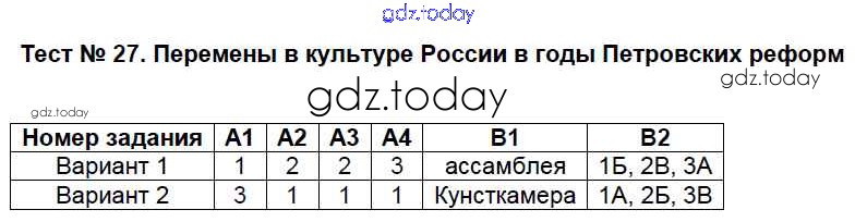 На страницах сайта gdz.today вы найдете учебный и вспомогательный материал, направленный на улучшения знаний школьной программы. ГДЗ - онлайн мир знаний Решение к тестам 27 Контрольно-измерительным материалам (КИМ) по Истории России для 7 класса Волкова ВАКО 2017