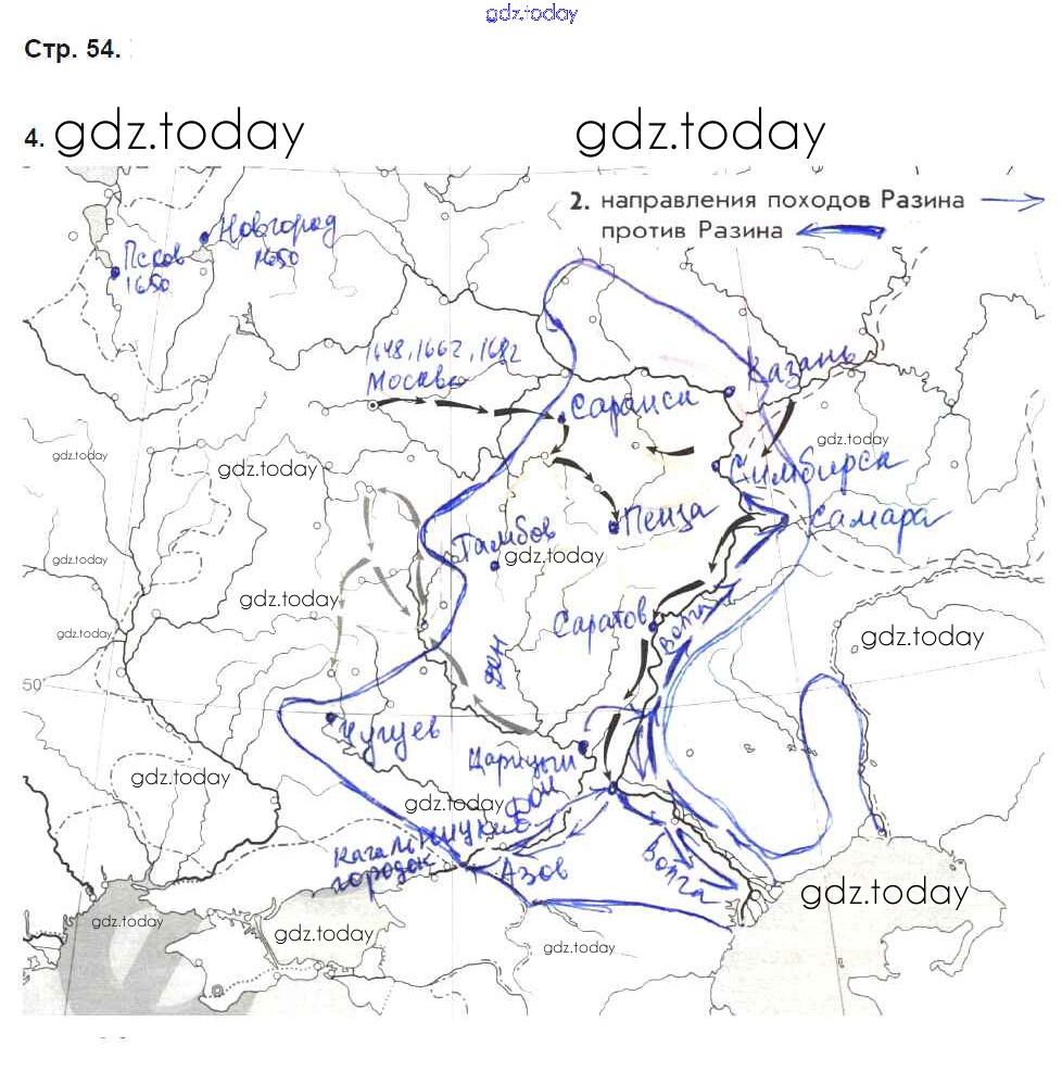 На страницах сайта gdz.today вы найдете учебный и вспомогательный материал, направленный на улучшения знаний школьной программы. ГДЗ - онлайн мир знаний Страницы (решение) 54 Рабочей тетради по Истории России для 7 класса Симонова, Клоков Дрофа УМК 2018