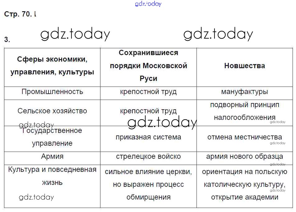 На страницах сайта gdz.today вы найдете учебный и вспомогательный материал, направленный на улучшения знаний школьной программы. ГДЗ - онлайн мир знаний Страницы (решение) 70 Рабочей тетради по Истории России для 7 класса Симонова, Клоков Дрофа УМК 2018