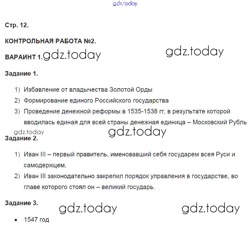 Ответы к Страницы (решение) 12 Контрольным работам по Истории России для 7 класса Артасов Просвещение УМК 2016