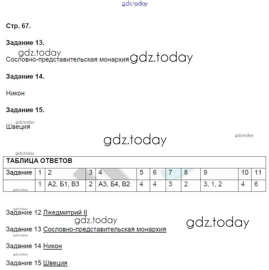 На страницах сайта gdz.today вы найдете учебный и вспомогательный материал, направленный на улучшения знаний школьной программы. ГДЗ - онлайн мир знаний Страницы (решение) 67 Контрольным работам по Истории России для 7 класса Артасов Просвещение УМК 2016