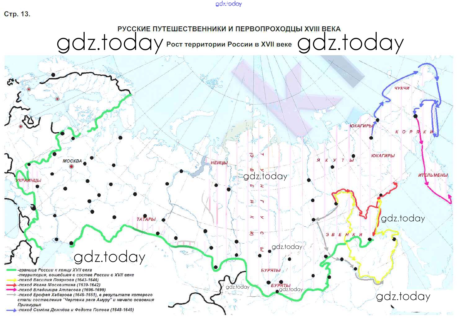 На страницах сайта gdz.today вы найдете учебный и вспомогательный материал, направленный на улучшения знаний школьной программы. ГДЗ - онлайн мир знаний Страницы (решение) 13 Контурным картам по Истории России для 7 класса Тороп Просвещение УМК 2020