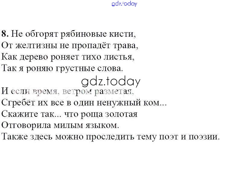 На страницах сайта gdz.today вы найдете учебный и вспомогательный материал, направленный на улучшения знаний школьной программы. ГДЗ - онлайн мир знаний Вопросы и задания «Отговорила роща золотая...» 8 Учебнику по Литературе для 7 класса Меркин Русское слово Инновационная школа 2017
