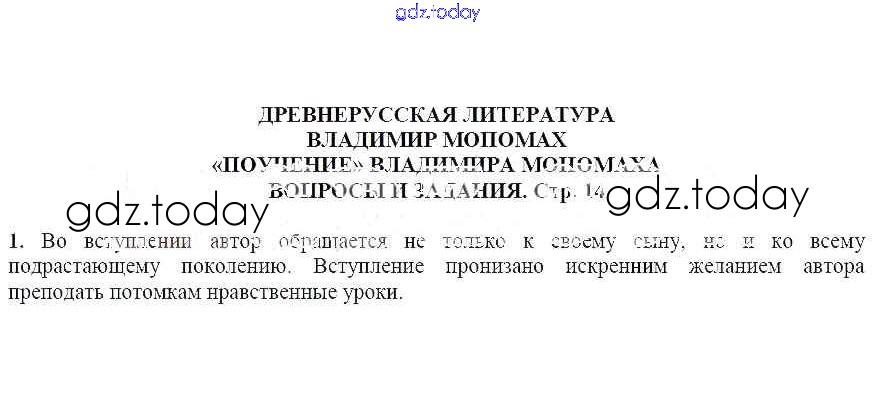 На страницах сайта gdz.today вы найдете учебный и вспомогательный материал, направленный на улучшения знаний школьной программы. ГДЗ - онлайн мир знаний Вопросы и задания «Поучение» Владимира Мономаха 1 Учебнику по Литературе для 7 класса Чертов, Трубина Просвещение 2018