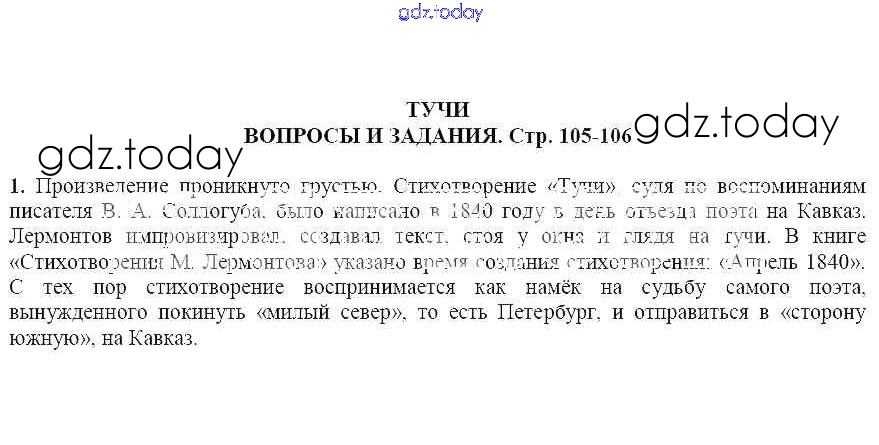На страницах сайта gdz.today вы найдете учебный и вспомогательный материал, направленный на улучшения знаний школьной программы. ГДЗ - онлайн мир знаний Вопросы и задания Тучи 1 Учебнику по Литературе для 7 класса Чертов, Трубина Просвещение 2018