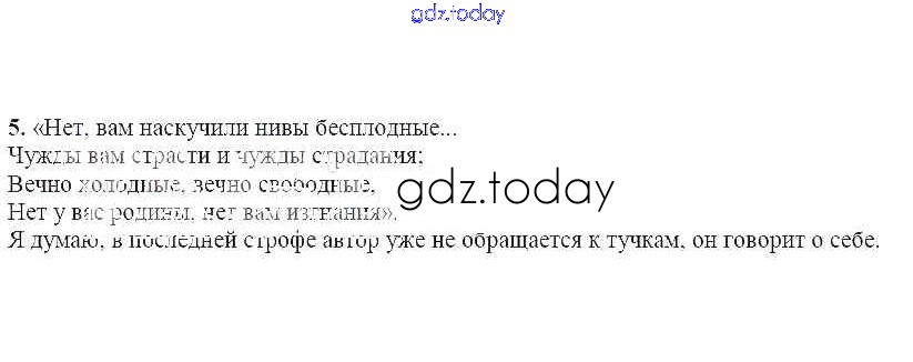 На страницах сайта gdz.today вы найдете учебный и вспомогательный материал, направленный на улучшения знаний школьной программы. ГДЗ - онлайн мир знаний Вопросы и задания Тучи 5 Учебнику по Литературе для 7 класса Чертов, Трубина Просвещение 2018