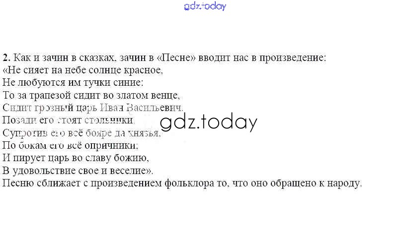 На страницах сайта gdz.today вы найдете учебный и вспомогательный материал, направленный на улучшения знаний школьной программы. ГДЗ - онлайн мир знаний Вопросы и задания Песня про царя Ивана Васильевича 2 Учебнику по Литературе для 7 класса Чертов, Трубина Просвещение 2018