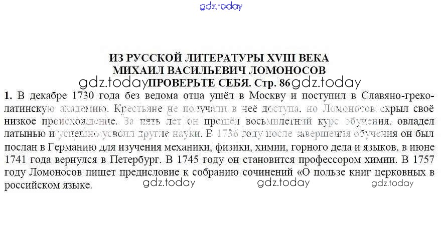 На страницах сайта gdz.today вы найдете учебный и вспомогательный материал, направленный на улучшения знаний школьной программы. ГДЗ - онлайн мир знаний Проверьте себя Из русской литературы XVIII века. Михаил Васильевич Ломоносов 1 Учебнику по Литературе для 7 класса Коровина, Журавлев Просвещение 2016