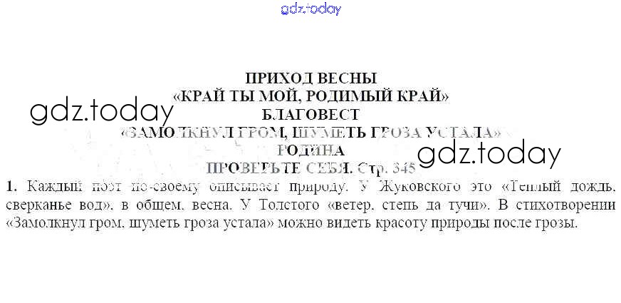 На страницах сайта gdz.today вы найдете учебный и вспомогательный материал, направленный на улучшения знаний школьной программы. ГДЗ - онлайн мир знаний Проверьте себя В. А. Жуковский. Приход весны. Благовест. Замолкнул гром... Родина 1 Учебнику по Литературе для 7 класса Коровина, Журавлев Просвещение 2016