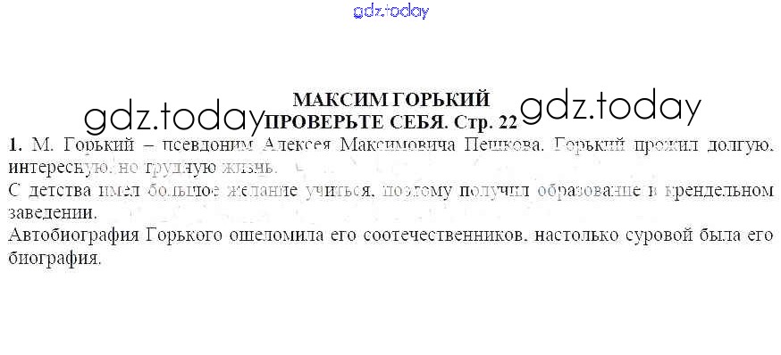 На страницах сайта gdz.today вы найдете учебный и вспомогательный материал, направленный на улучшения знаний школьной программы. ГДЗ - онлайн мир знаний Проверьте себя Максим Горький 1 Учебнику по Литературе для 7 класса Коровина, Журавлев Просвещение 2016