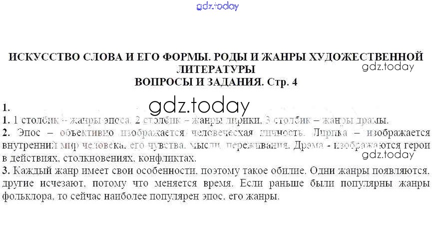На страницах сайта gdz.today вы найдете учебный и вспомогательный материал, направленный на улучшения знаний школьной программы. ГДЗ - онлайн мир знаний Вопросы и задания Искусство слова и его формы. Роды и жанры художественной литературы 1 Учебнику-хрестоматии по Литературе для 7 класса Курдюмова Дрофа Вертикаль 2018