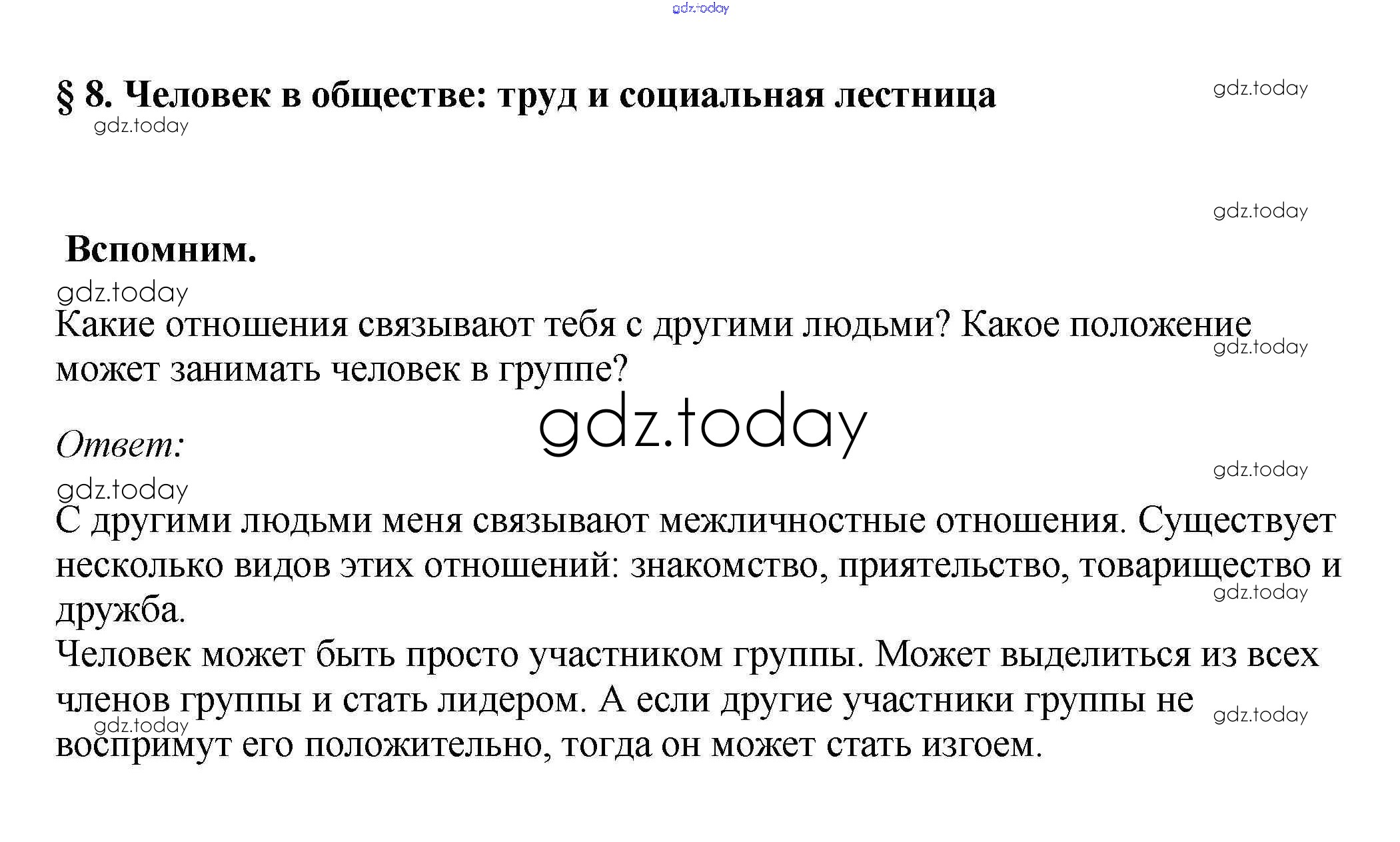 На страницах сайта gdz.today вы найдете учебный и вспомогательный материал, направленный на улучшения знаний школьной программы. ГДЗ - онлайн мир знаний Вспомним §8. Человек в обществе: труд и социальная лестница 1 Учебнику по Обществознанию для 7 класса Боголюбов, Городецкая Просвещение, Просвещение Академический школьный учебник 2015, 2019