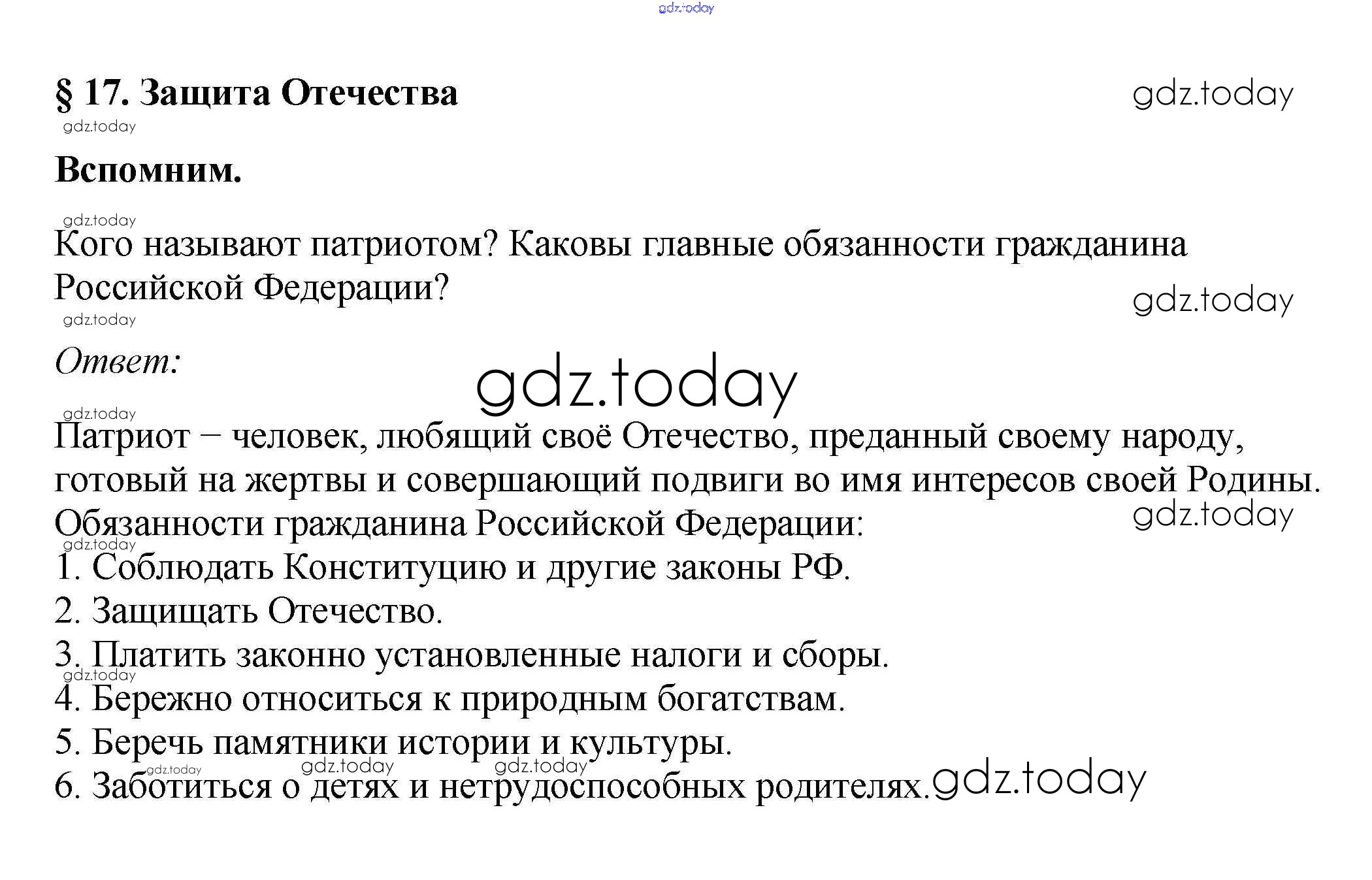 На страницах сайта gdz.today вы найдете учебный и вспомогательный материал, направленный на улучшения знаний школьной программы. ГДЗ - онлайн мир знаний Вспомним §17. Защита Отечества 1 Учебнику по Обществознанию для 7 класса Боголюбов, Городецкая Просвещение, Просвещение Академический школьный учебник 2015, 2022