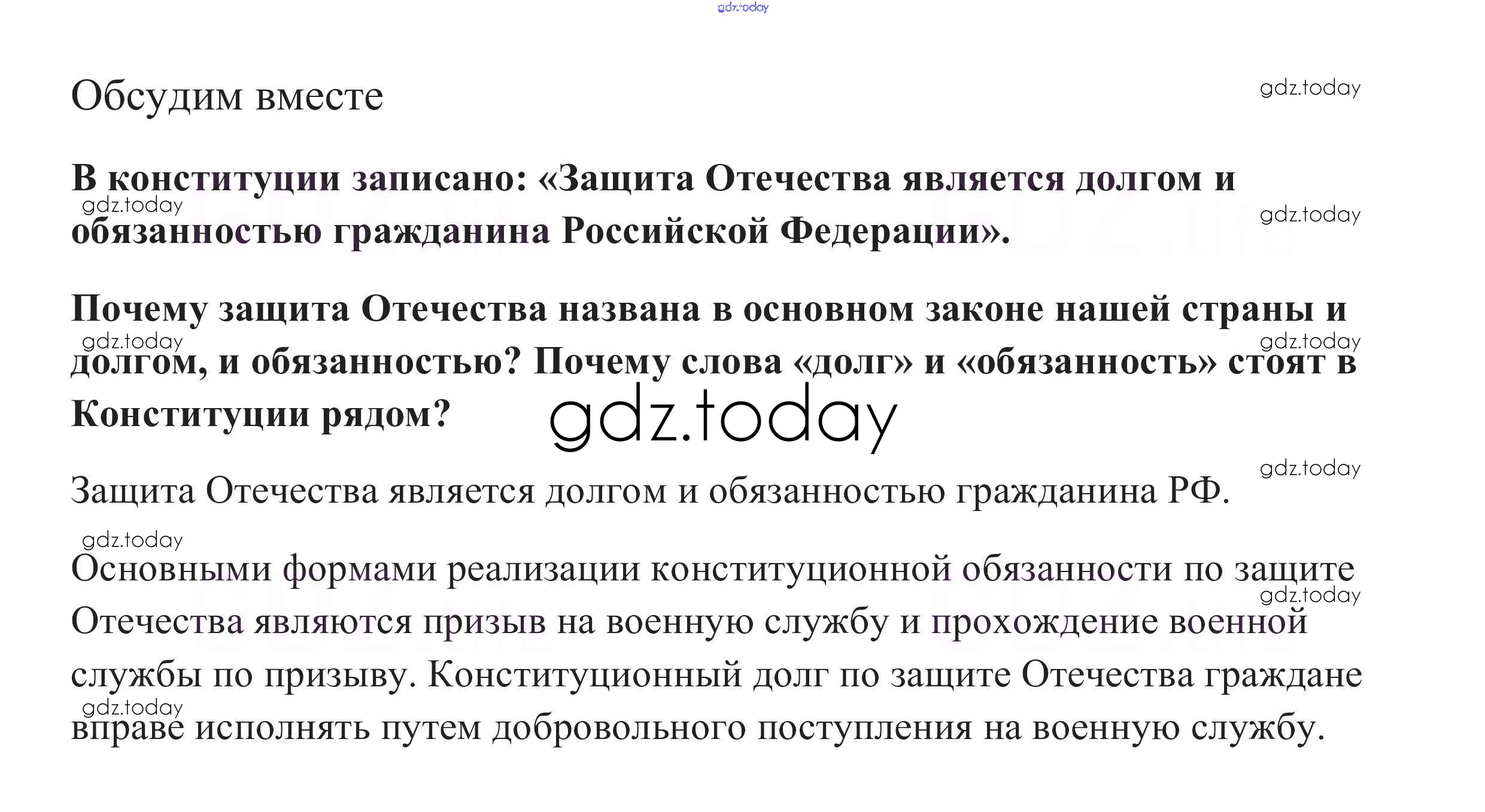 На страницах сайта gdz.today вы найдете учебный и вспомогательный материал, направленный на улучшения знаний школьной программы. ГДЗ - онлайн мир знаний Обсудим вместе §4. Защита Отечества 1 Учебнику по Обществознанию для 7 класса Боголюбов, Городецкая Просвещение, Просвещение Академический школьный учебник 2015, 2022