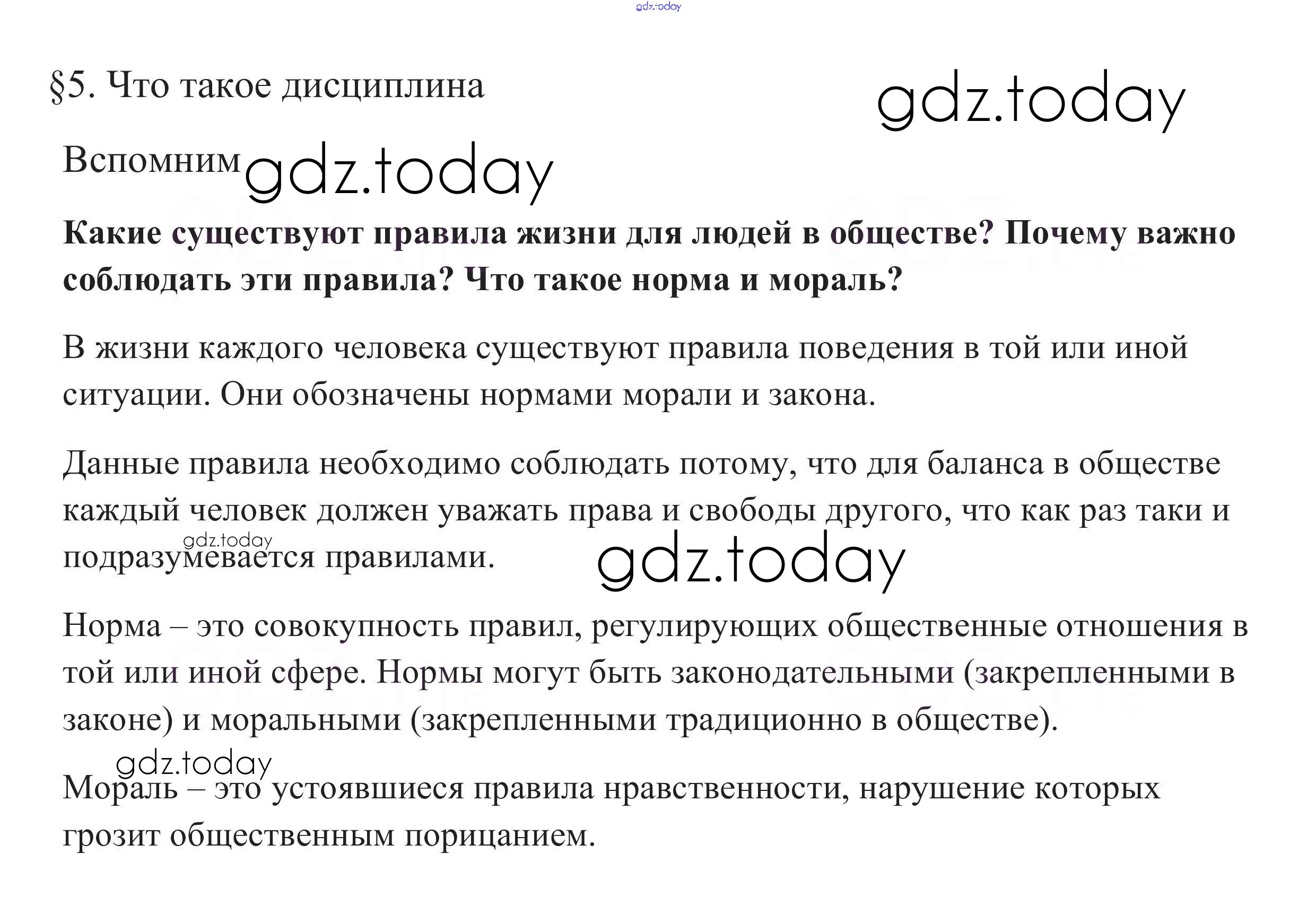 На страницах сайта gdz.today вы найдете учебный и вспомогательный материал, направленный на улучшения знаний школьной программы. ГДЗ - онлайн мир знаний Вспомним §5. Для чего нужна дисциплина 1 Учебнику по Обществознанию для 7 класса Боголюбов, Городецкая Просвещение, Просвещение Академический школьный учебник 2015, 2022