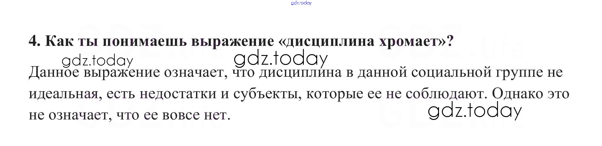 На страницах сайта gdz.today вы найдете учебный и вспомогательный материал, направленный на улучшения знаний школьной программы. ГДЗ - онлайн мир знаний Проверим себя §5. Для чего нужна дисциплина 4 Учебнику по Обществознанию для 7 класса Боголюбов, Городецкая Просвещение, Просвещение Академический школьный учебник 2015, 2022