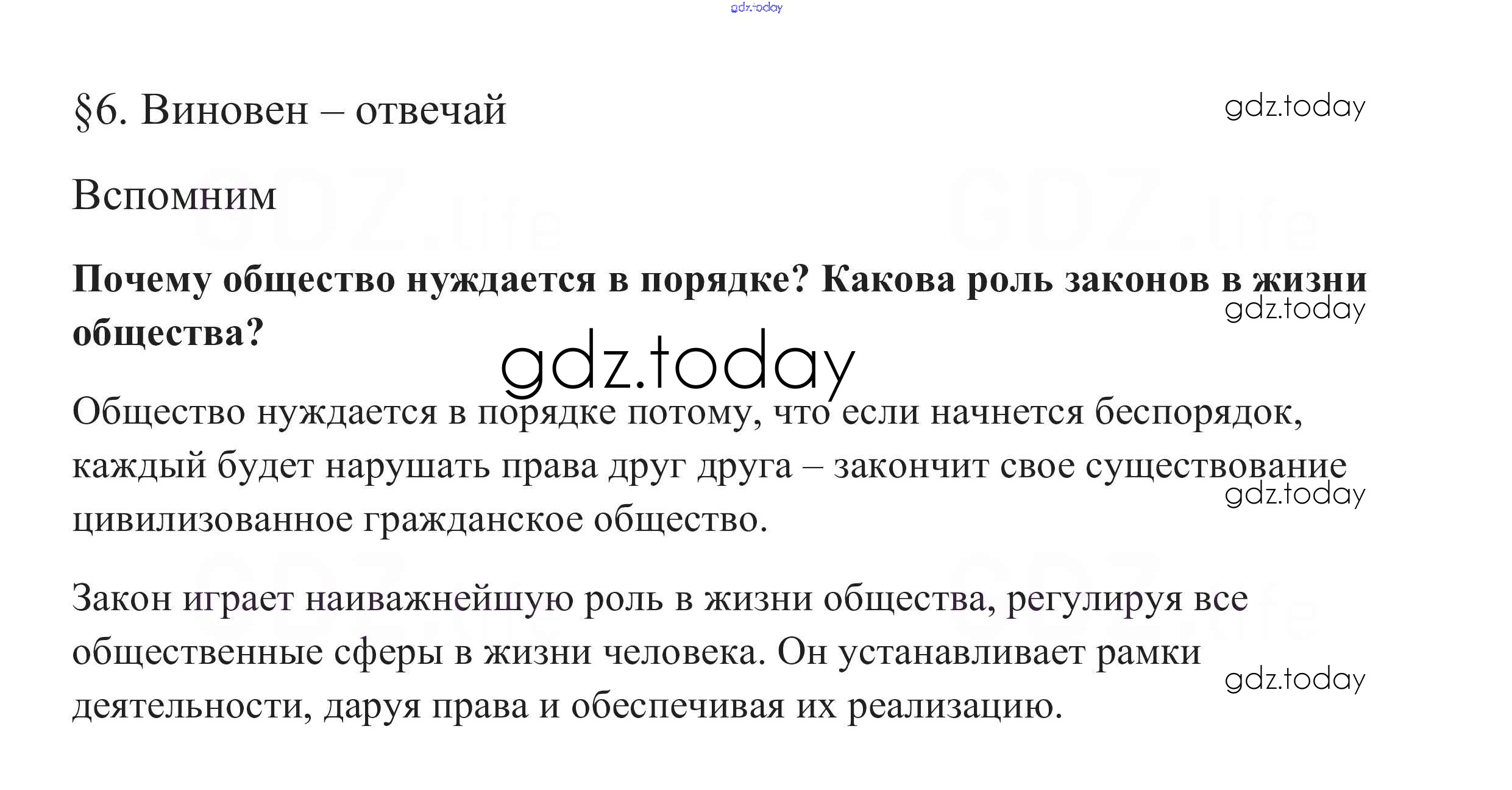 На страницах сайта gdz.today вы найдете учебный и вспомогательный материал, направленный на улучшения знаний школьной программы. ГДЗ - онлайн мир знаний Вспомним §6. Виновен - отвечай 1 Учебнику по Обществознанию для 7 класса Боголюбов, Городецкая Просвещение, Просвещение Академический школьный учебник 2015, 2022