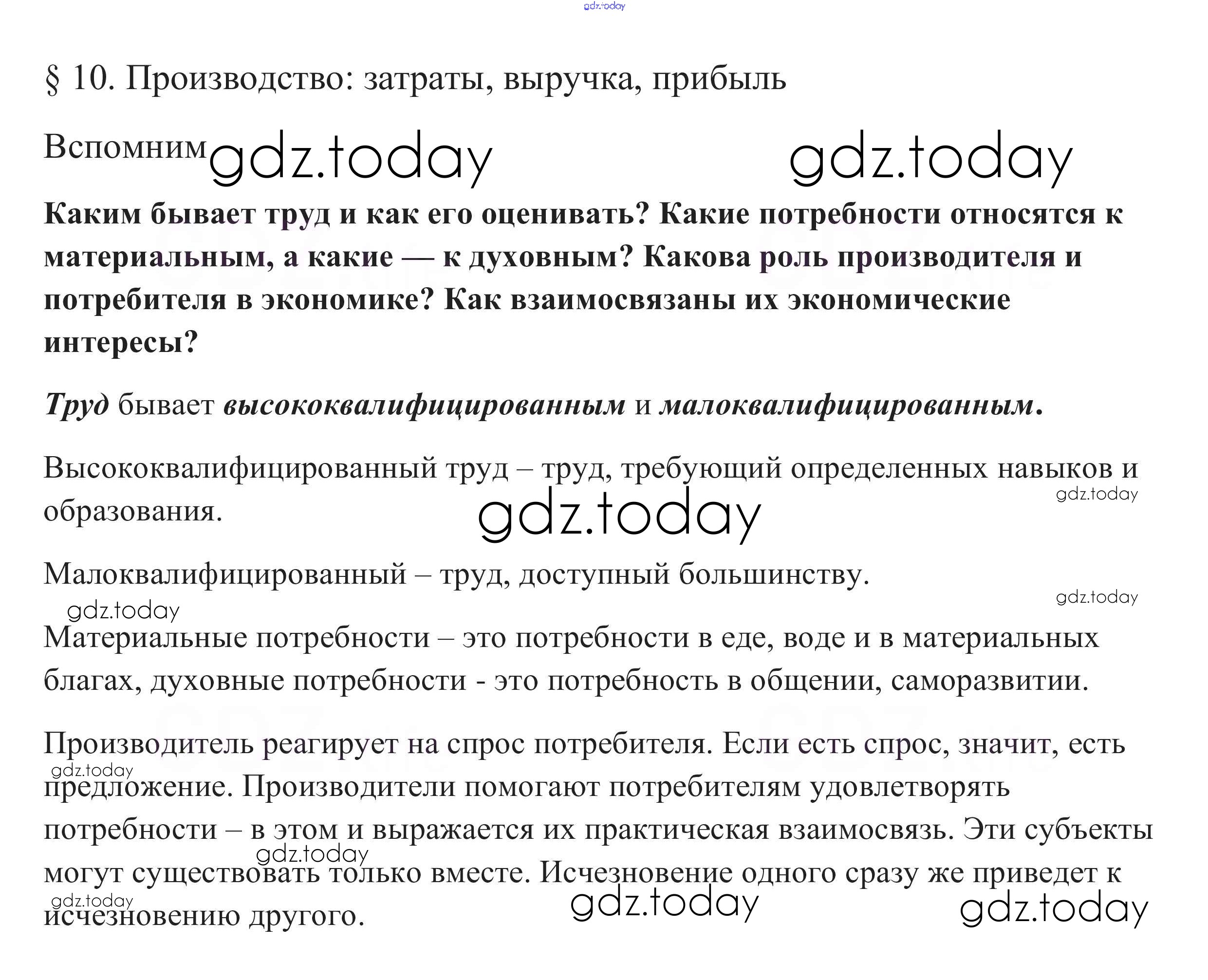 На страницах сайта gdz.today вы найдете учебный и вспомогательный материал, направленный на улучшения знаний школьной программы. ГДЗ - онлайн мир знаний Вспомним §10. Производство: затраты , выручка, прибыль 1 Учебнику по Обществознанию для 7 класса Боголюбов, Городецкая Просвещение, Просвещение Академический школьный учебник 2015, 2019