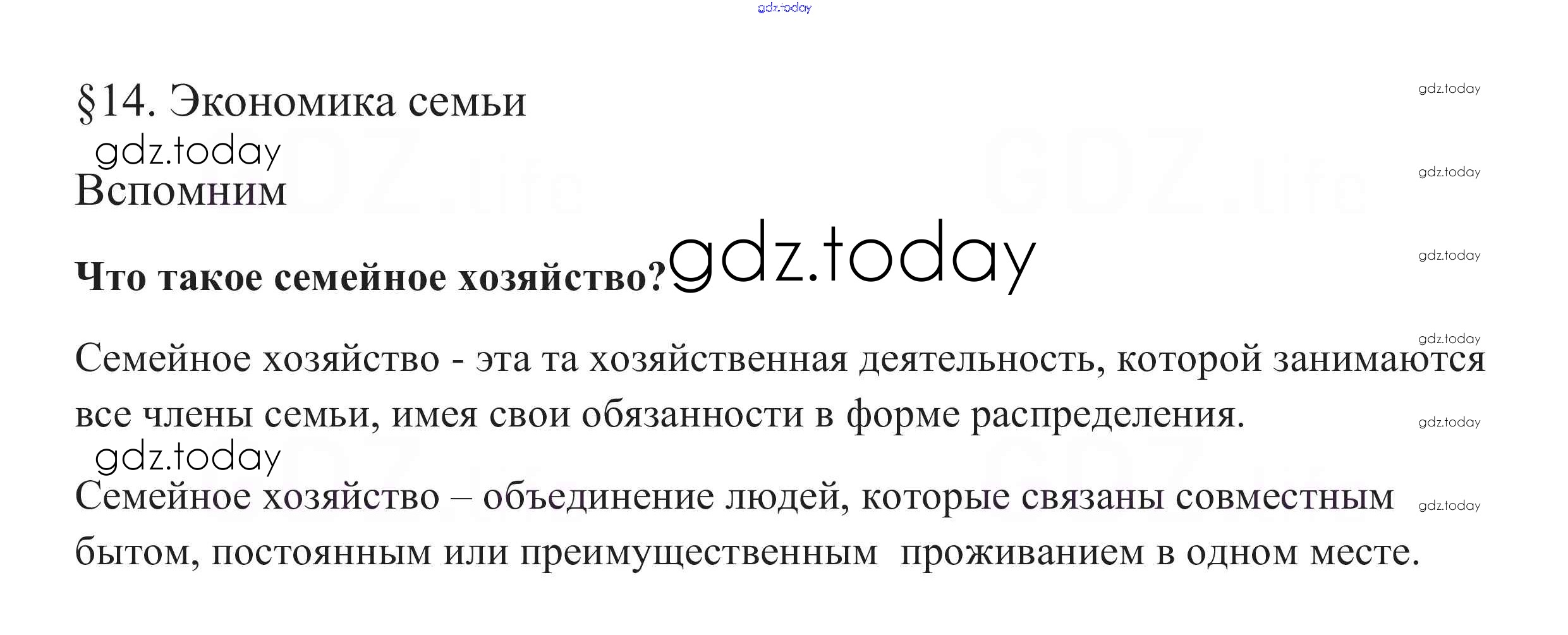 На страницах сайта gdz.today вы найдете учебный и вспомогательный материал, направленный на улучшения знаний школьной программы. ГДЗ - онлайн мир знаний Вспомним §14. Экономика семьи 1 Учебнику по Обществознанию для 7 класса Боголюбов, Городецкая Просвещение, Просвещение Академический школьный учебник 2015, 2022