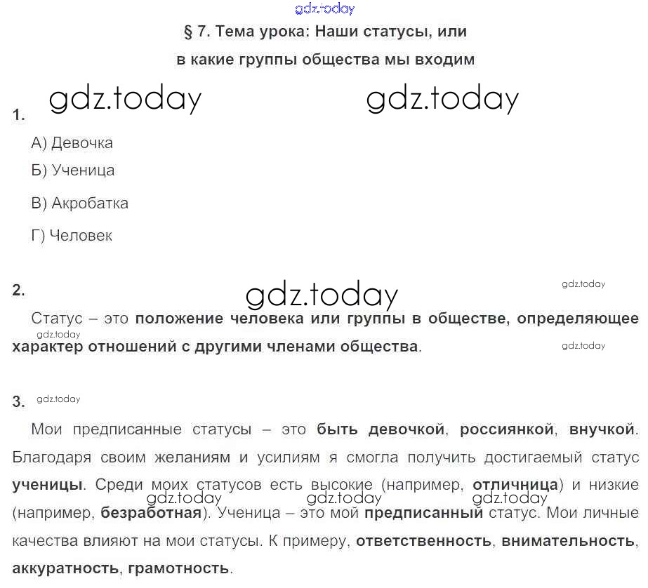 На страницах сайта gdz.today вы найдете учебный и вспомогательный материал, направленный на улучшения знаний школьной программы. ГДЗ - онлайн мир знаний Решение к § 7. Наши статусы, или в какие группы общества мы входим страница 25 Рабочей тетради по Обществознанию для 7 класса Соболева Вентана-граф Алгоритм успеха 2018
