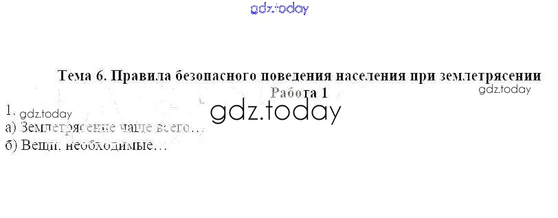 На страницах сайта gdz.today вы найдете учебный и вспомогательный материал, направленный на улучшения знаний школьной программы. ГДЗ - онлайн мир знаний Работа 1 Решение к теме 6. Правила безопасного поведения населения при землетрясении 1 Рабочей тетради по ОБЖ для 7 класса Демидов Лицей 2016