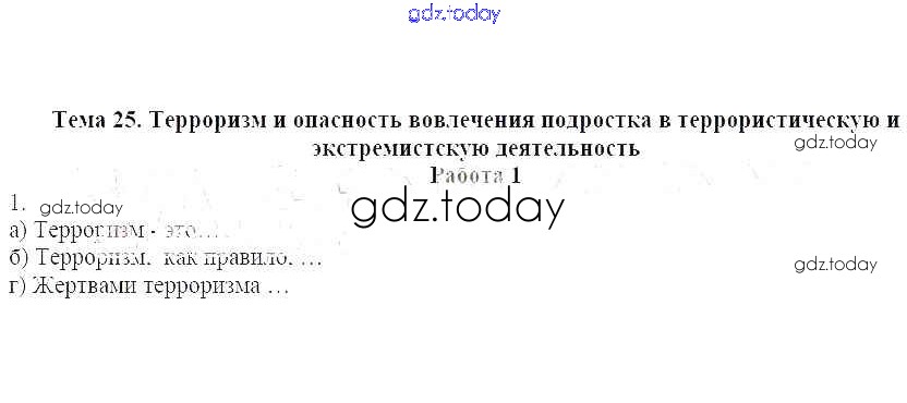 На страницах сайта gdz.today вы найдете учебный и вспомогательный материал, направленный на улучшения знаний школьной программы. ГДЗ - онлайн мир знаний Работа 1 Решение к теме 25. Терроризм и опасность вовлечения подростка в террористическую и экстремистскую деятельность 1 Рабочей тетради по ОБЖ для 7 класса Демидов Лицей 2016