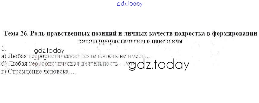 На страницах сайта gdz.today вы найдете учебный и вспомогательный материал, направленный на улучшения знаний школьной программы. ГДЗ - онлайн мир знаний Решение к теме 26. Роль нравственных позиций и личных качеств подростка в формировании антитеррористического поведения 1 Рабочей тетради по ОБЖ для 7 класса Демидов Лицей 2016