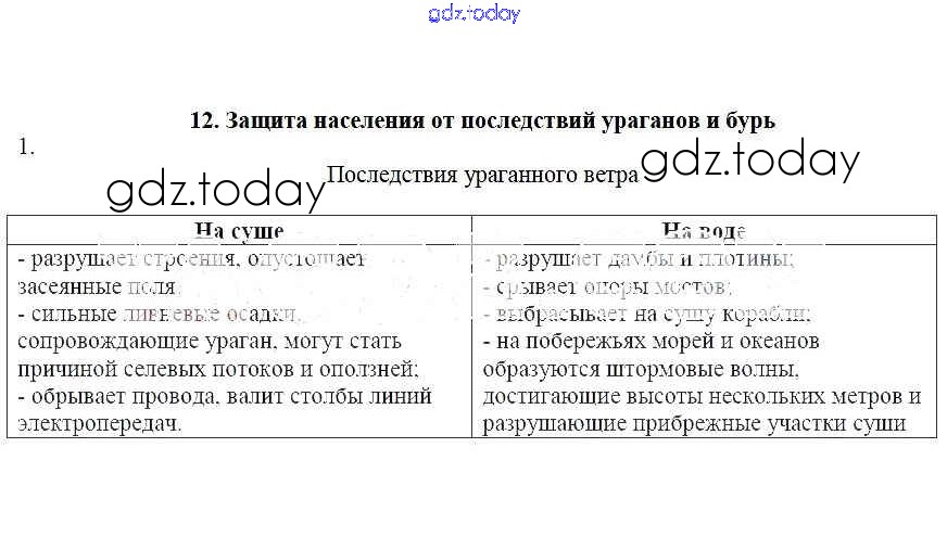 На страницах сайта gdz.today вы найдете учебный и вспомогательный материал, направленный на улучшения знаний школьной программы. ГДЗ - онлайн мир знаний Решение к теме 12. Защита населения от последствий ураганов и бурь 1 Рабочей тетради по ОБЖ для 7 класса Егорова Лицей 2012