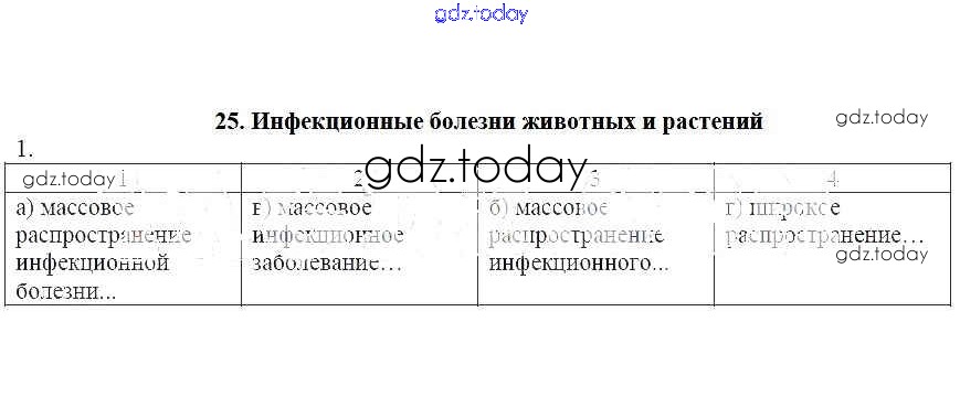 На страницах сайта gdz.today вы найдете учебный и вспомогательный материал, направленный на улучшения знаний школьной программы. ГДЗ - онлайн мир знаний Решение к теме 25. Инфекционные болезни животных и растений 1 Рабочей тетради по ОБЖ для 7 класса Егорова Лицей 2012