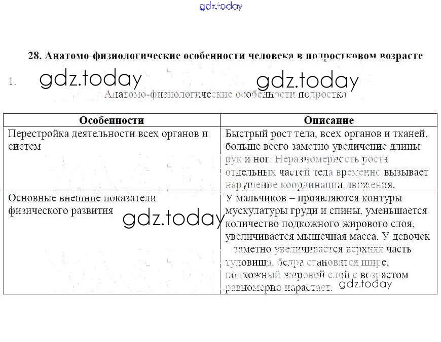 На страницах сайта gdz.today вы найдете учебный и вспомогательный материал, направленный на улучшения знаний школьной программы. ГДЗ - онлайн мир знаний Решение к теме 28. Анатомо-физиологические особенности человека в подростковом возрасте 1 Рабочей тетради по ОБЖ для 7 класса Егорова Лицей 2012