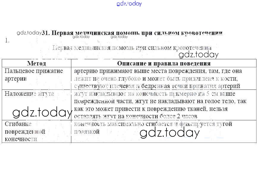 На страницах сайта gdz.today вы найдете учебный и вспомогательный материал, направленный на улучшения знаний школьной программы. ГДЗ - онлайн мир знаний Решение к теме 31. Первая медицинская помощь при сильном кровотечении 1 Рабочей тетради по ОБЖ для 7 класса Егорова Лицей 2012