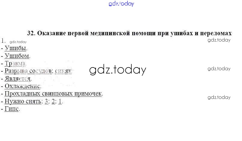 На страницах сайта gdz.today вы найдете учебный и вспомогательный материал, направленный на улучшения знаний школьной программы. ГДЗ - онлайн мир знаний Решение к теме 32. Оказание первой медицинской помощи при ушибах и переломах 1 Рабочей тетради по ОБЖ для 7 класса Егорова Лицей 2012