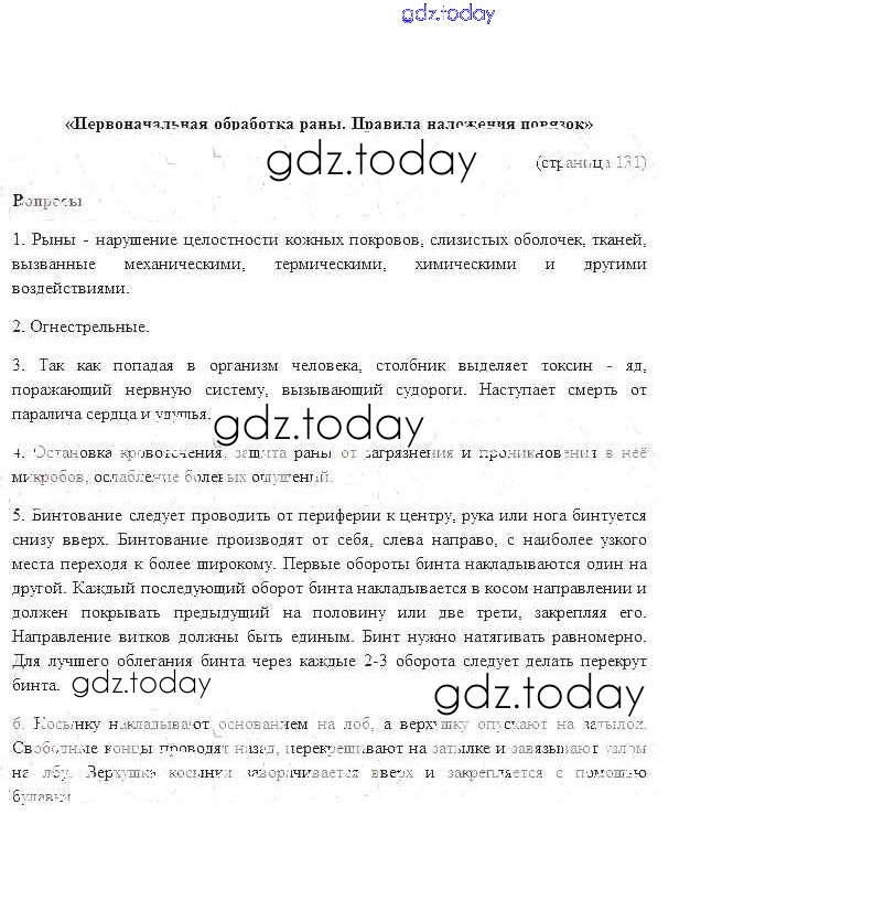 На страницах сайта gdz.today вы найдете учебный и вспомогательный материал, направленный на улучшения знаний школьной программы. ГДЗ - онлайн мир знаний Страницы (решение) 131 Учебнику по ОБЖ для 7 класса Фролов, Юрьева Дрофа 2018