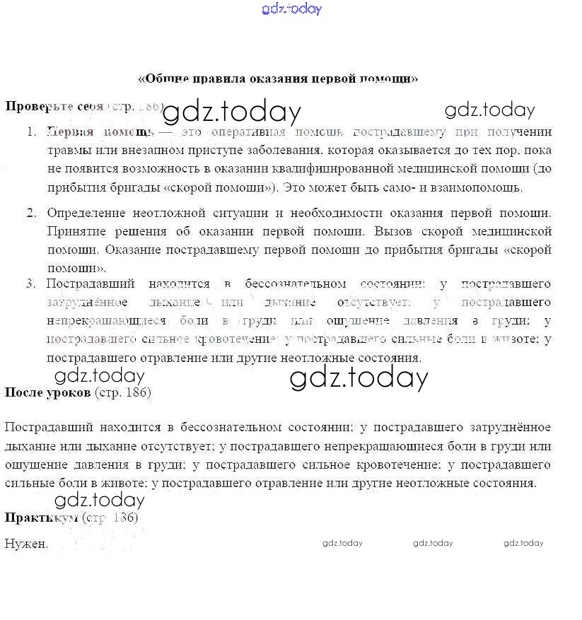На страницах сайта gdz.today вы найдете учебный и вспомогательный материал, направленный на улучшения знаний школьной программы. ГДЗ - онлайн мир знаний Страницы (решение) 186 Учебнику по ОБЖ для 7 класса Смирнов, Хренников Просвещение 2018